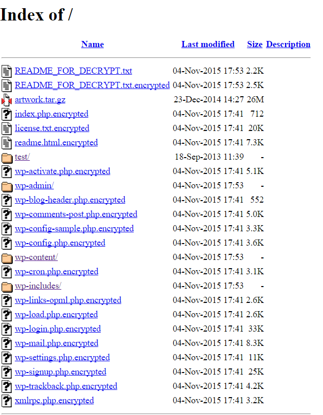 De hecho, vemos aquí algunos ejemplos de sitios afectados. Parece que varios de ellos, ya estaban previamente comprometidos y alojaban shells en PHP (síntoma de un compromiso de "perfil bajo"). Esto quiere decir que fueron víctimas de esos bots que buscan sitios aleatorios en PHP vulnerables previamente, y que ya estaban en manos de atacantes antes de que les este malware cifrara su web.