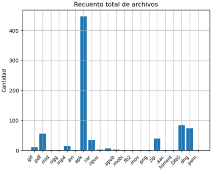 Esta imagen muestra un gráfico relacionado con la cantidad de archivos (diferenciados por extensión) de una de las colecciones seleccionadas, que contiene los grupos y canales que el discriminador detectó que son activos. Como podemos observar, la gran mayoría de archivos que se mueven por Telegram son ejecutables de Android, facilitando tareas de inyección de malware a través de ellos ya que este tipo de archivos son instalados por los usuarios, con una errónea confianza y que puede provocar un gran impacto en los dispositivos. Es curioso el uso de ficheros de imágenes .dng en determinados grupos, que finalmente resultaron ser renombres de otros ejecutables maliciosos.