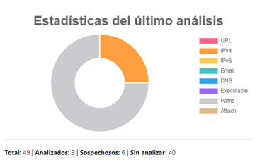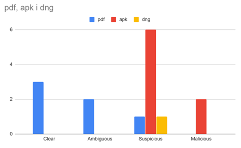 Los resultados finales indicaban que, en cada muestra de ficheros seleccionados, principalmente .pdf. dng y .apk, existía cierto ratio de elementos maliciosos, lo que podía servir de base para generar o enriquecer IoCs vinculados a dichos ficheros. Significando esto una PoC del uso que esta herramienta podría tener como sistema automatizado de extracción, categorización y generación de IoCs en una red social masiva como es Telegram. La figura siguiente representa los resultados de una de las muestras de 15 aplicaciones seleccionadas aleatoriamente como representante de todo el conjunto.