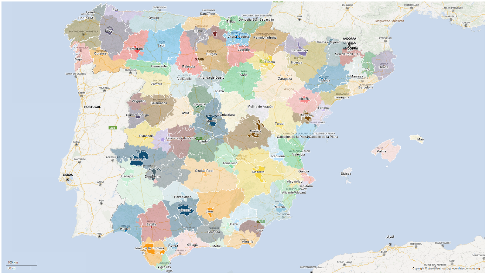 - Transporte e Infraestructuras: Ya que es un mapa obtenido con la información de la movilidad, es evidente que éste sea el primer punto. Conocer la distribución de estas comunidades puede permitirnos replanificar la red de carreteras. Por ejemplo, sería interesante tener buenas conexiones entre todos los municipios que son capitales de su región, o entre los municipios de una comunidad y su “capital”. Sería interesante también estudiar las fronteras de las comunidades: al indicarnos que dos municipios están separados el algoritmo nos indica que hay un bajo tráfico entre ambas lo que nos puede informar de pobres infraestructuras entre los municipios que fuerce a la población a utilizar otras rutas. También podemos usar el análisis para estudiar el impacto en movilidad antes y después de la construcción de una nueva carretera.