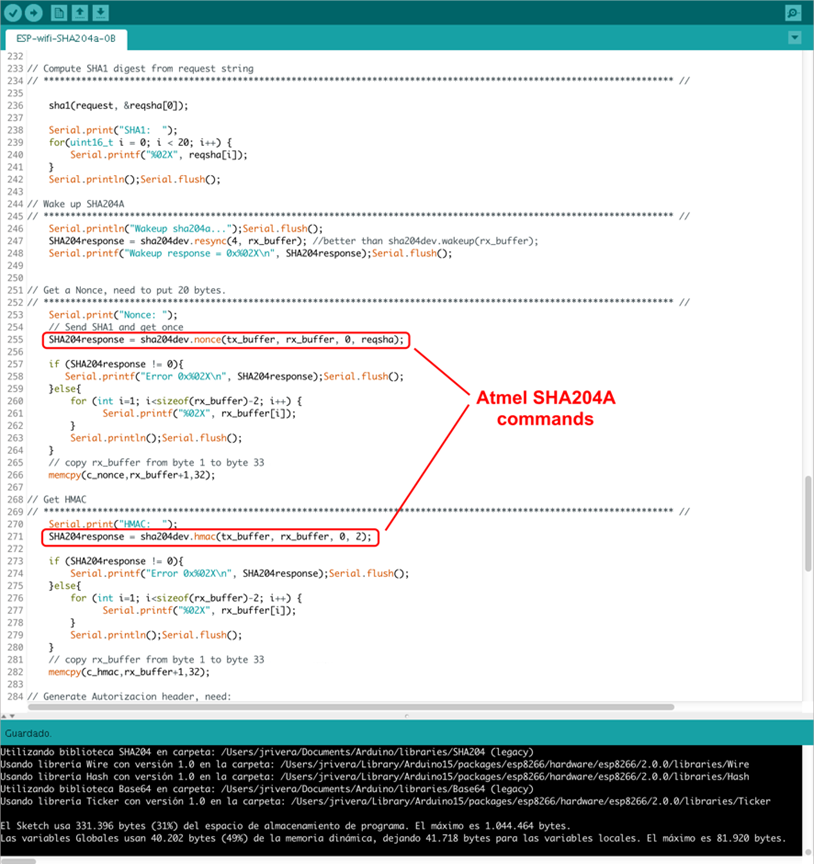 Para poder realizar la firma de la petición HTTP con el Atmel SHA204A, esta se resume a 20 bytes mediante el algoritmo SHA-1. El core de Arduino para ESP8266 incluye esta función en la librería " Hash.h", pero en caso de utilizar otra plataforma se puede añadir desde la Crytosuite para Arduino.
