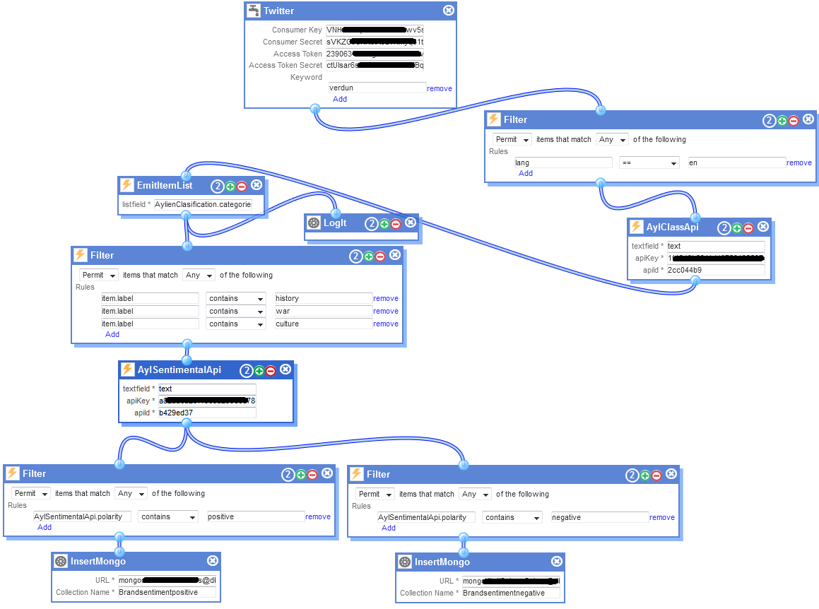 APPLY ADVANCED ANALYTICS: Now I add to my topology the module named “ AlyClassApi” which sends the text, in English and mentioning the word Verdun, to a sentiment analysis cloud service called Aylien (after creating a free user account – 2000 queries per day) which will classify the text in the tweet according to some predefined categories.