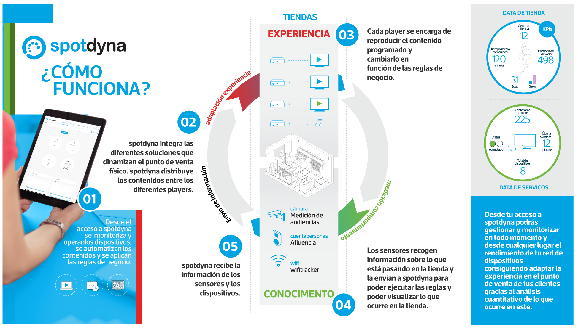 Gracias a que spotdyna es el sistema operativo de la tienda; las reglas definidas, el funcionamiento de los sensores, la medición y comportamiento y la adaptación de la experiencia son una realidad. La plataforma inteligente de Telefónica es el núcleo capaz de ayudar a las compañías a aumentar sus ventas e impactar en el negocio gracias a la tecnología instalada en el punto de venta.