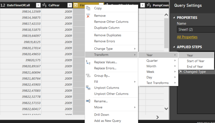 El formato del campo “DateTimeOfCall” tampoco parece el adecuado. En este caso, optamos por la opción “Change Type” del mismo menú, y lo convertimos en formato decimal.