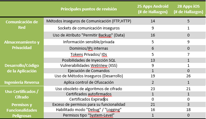 Entre los principales hallazgos de este tipo de fallos, seguimos encontrando grandes posibilidades de explotación de Inyección SQL y XSS (Cross Site Scripting) sobre la App y en 10 aplicaciones encontramos cómo utilizando “Webviews” se podía ejecutar código JavaScript o agregar librerías HTML.