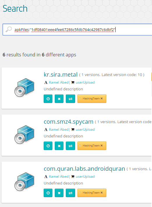We have studied some details of the leaked APKs. They were not public until this recent attack, and they were not detected by many antivirus engines until the leak. It is not the first time that we know about this company's APKs. During 2014 summer, some remote control Android apps were known to belong to this HackingTeam, and they were used to spy mobile devices.