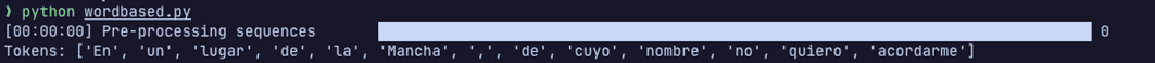 Le pasamos el texto del Quijote (no tarda prácticamente nada en realizar el entrenamiento) y guardamos nuestro 'vocabulario' (luego veremos cómo está formado por dentro) para usarlo posteriormente si queremos, ahorrándonos el entrenamiento.