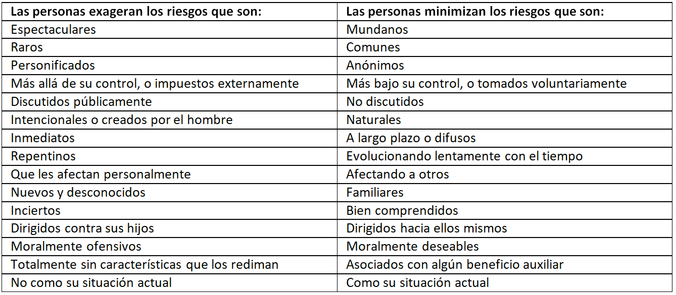 Bruce Scheneier a partir de la literatura científica sobre el tema, recoge cómo las personas percibimos los riesgos en términos generales: