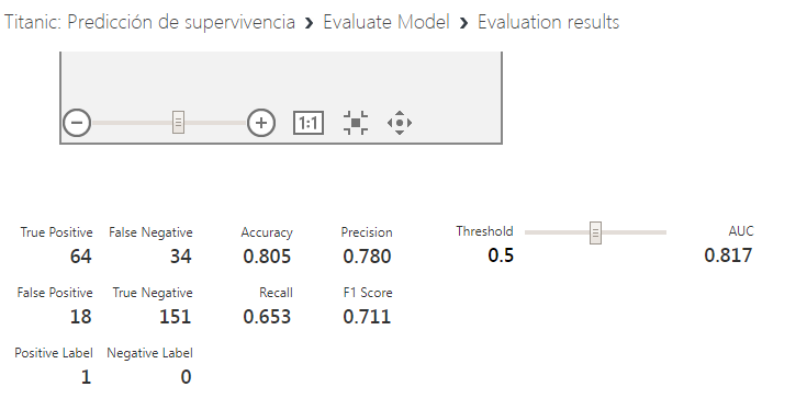“Evaluate Model/evaluation results/visualize”, podemos ver la curva ROC, la proporción de Falsos Positivos/Falsos Negativos (ver post sobre “Tipos de error en ML”), el valor AUC y otras métricas. En concreto, el valor AUC es de 0.814, es un valor bueno.