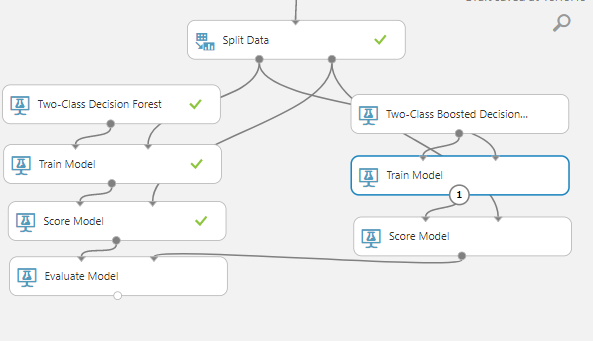Si queremos comparer nuestro modelo con otro basado en un algoritmo diferente, no tenemos más que elegir otro algoritmo, copiar y pegar los módulos que “Train Model” y “Score Model” que ya teníamos, y conectarlos entre ellos y con los conjuntos de datos de la misma forma que hemos hecho antes. La salidad del “Score Module” la llevamos al “Evaluation Module” que teníamos anteriormente y así podemos comparar el rendimiento de dos modelos de machine Learning que hemos entrenado por separado.
