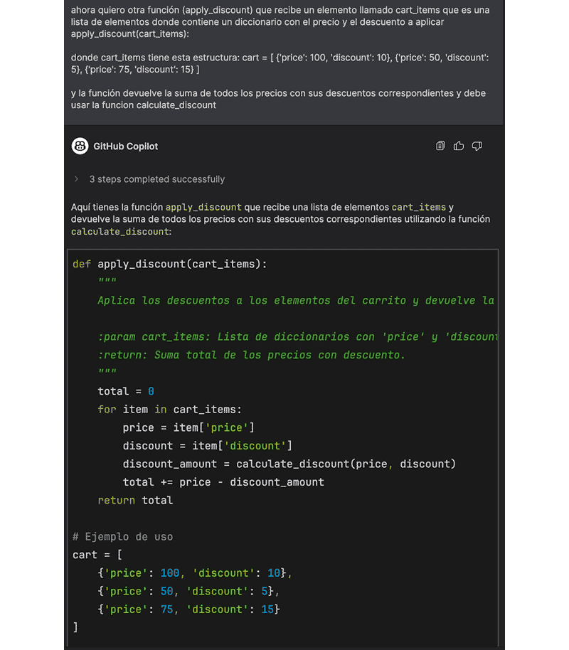 ■ Con este código lo que está generando la IA son escenarios de prueba. En cada carrito (cart) hay una serie de artículos y un descuento. En la línea inferior simplemente ha calculado cual sería el precio de ese carrito con los descuentos correspondientes aplicados. En caso de que haya una discrepancia entre lo que espera que sea el resultado y lo que ha devuelto realmente se producirá un error, porque los valores no se corresponden.