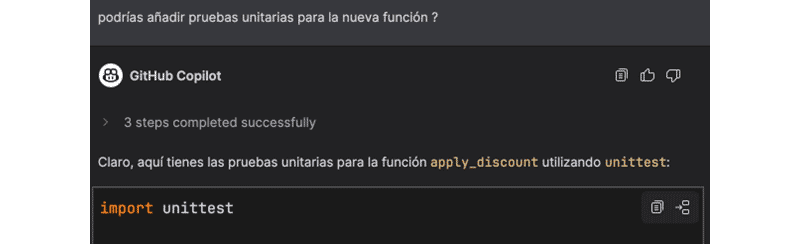 Por suerte en su proyecto no se acepta código que no tenga pruebas unitarias con lo que su PR (Pull request o solicitud de añadir código) ha sido rechazada de forma automática. Con lo que Elon tiene que añadir pruebas a su código antes de poder marcar su tarea como completada. Ni corto ni -poco- perezoso Elon, que tiene todo el contexto disponible en su IDE, decide pedírselo a Copilot: