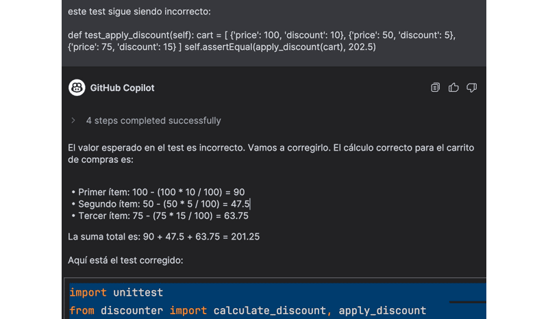Y ahora Elon cargado de razón avisa a Copilot de que hay un error en el cálculo que está esperando el test, pero esta IA es un poco testaruda y tras dos infructuosos intentos, Elon tiene copiar el código que la misma IA ha generado previamente para que termine de “creérselo y entender el problema”. Finalmente detecta donde está el error:
