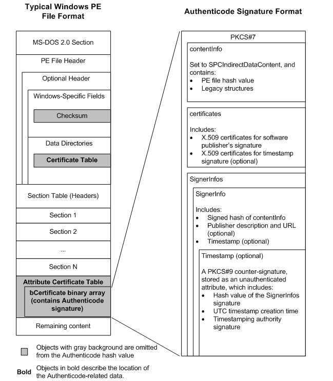 Pero nada de esto es totalmente cierto. Como veremos en la siguiente entrega, no es raro encontrar ficheros en los que se usa MD5 para firmar su contenido. También hay que aclarar que el SHA-1 calculado no se realiza sobre todos los bits del archivo original, sino que se omiten algunas partes en la cabecera porque luego, una vez firmado, cambiarán. Así que el hash original del fichero antes de la firma no es el hash firmado por Authenticode. Según la documentación oficial: