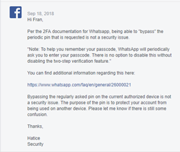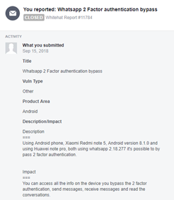 En el video se ve como con la verificación en 2 pasos activa es posible acceder a la información de las conversaciones sin conocer el código, esto nos llevó a pensar en una posible vulnerabilidad por lo que contactamos con el equipo de seguridad de Facebook, los responsables de WhatsApp y quienes gestionan su bug bounty, Nuestro mensaje decía lo siguiente: