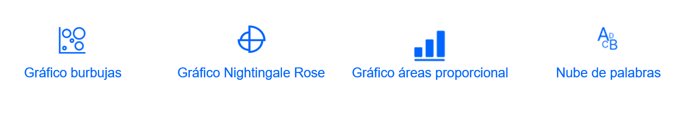 En este apartado se observa aquellos gráficos que responden a la necesidad de realizar una proporción entre valores. Para ello gráficos como el gráfico de burbujas, gráfico de Nightingale Rose, gráfico de áreas proporcional o nube de palabras darían buenos resultados.