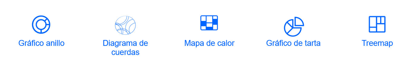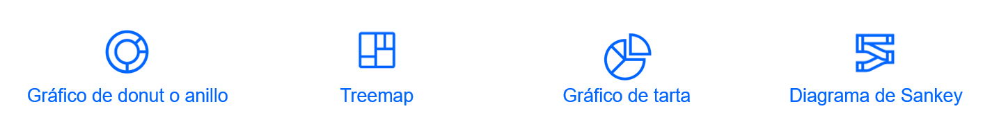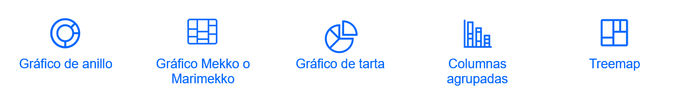 En este apartado se analizan aquellos métodos de visualización que permiten mostrar partes de un total de una o más variables. Generalmente el gráfico de anillo o donut, gráfico Mekko, gráfico de tarta, gráfico de columnas agrupadas y el treemap daría un resultado correcto.