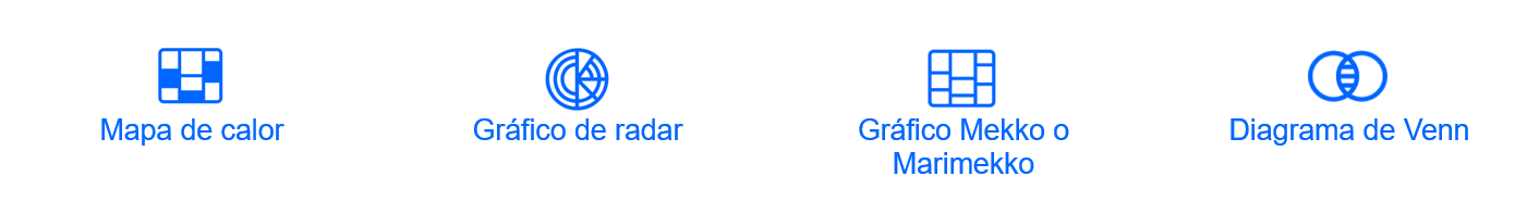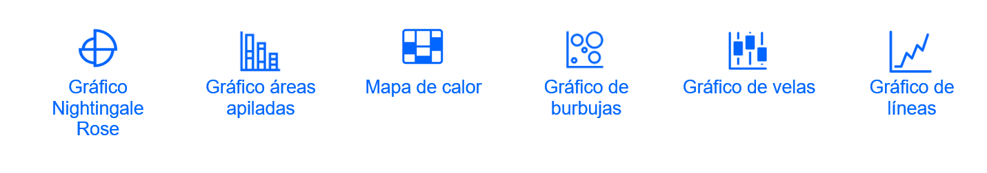 Los gráficos que emplear podrían ser el gráfico de Nightingale Rose, gráfico de áreas apiladas, mapa de calor, gráfico de burbujas, gráfico de velas o el gráfico de líneas entre otros.