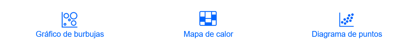 En cuanto a correlaciones se refiere, los mejores gráficos son el gráfico de burbujas, mapa de calor o el diagrama de puntos.