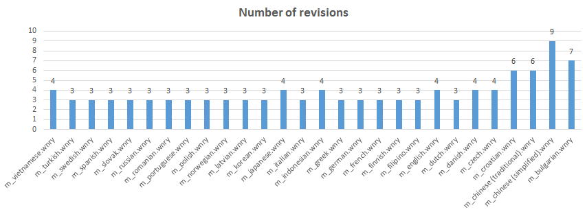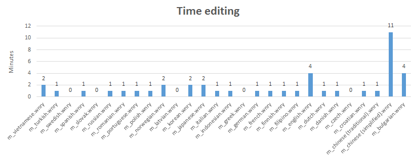 Tras este, muchos otros ficheros se fueron creando secuencialmente (o de nuevo, los volcó desde algún fichero zip o de un disco) hasta las 15:00. Los ficheros chinos (tradicional) y chino (simplificado) fueron los últimos, abiertos casi 4 horas más tarde, a las 18:55. Tardó 11 minutos en editar el fichero de versión "simplificado", pero le llevó justo un minuto editar el de versión "tradicional". Antes de esto, estuvo 4 minutos editando el fichero inglés. Los ficheros de idiomas japonés y vietnamita le llevaron también 4 minutos de edición. El fichero vietnamita fue el último en abrir en la primera ronda de edición, quizás porque los ficheros estaban ordenados alfabéticamente. Otros ficheros como el sueco, letón, checo o griego no los editó.