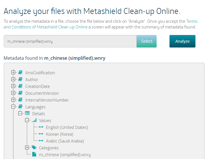 Wannacry 2.0 utiliza algunos archivos de texto con las instrucciones para mostrar en un cuadro de texto. A primera vista, la extensión WRNY no significa nada, pero en realidad son archivos RTF. Lo que da margen para trabajar con metadatos. Para este análisis hemos usado nuestra recién estrenada herramienta Metashield Clean-up Online. Como resulado podemos encontrar a "Messi" como usuario en el sistema, los idiomas configurados en el editor de texto y las fechas y tiempos de edición. Sobre la cadena "Messi", descubrimos que algunos usuarios ya lo habían mencionado días atrás. Pero vamos a ir más allá.