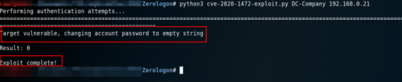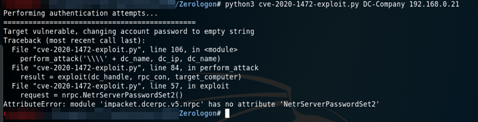 Y, como se observa pasando ese parámetro junto con la IP, el script nos da como resultado si el DC es vulnerable a Zerologon.
