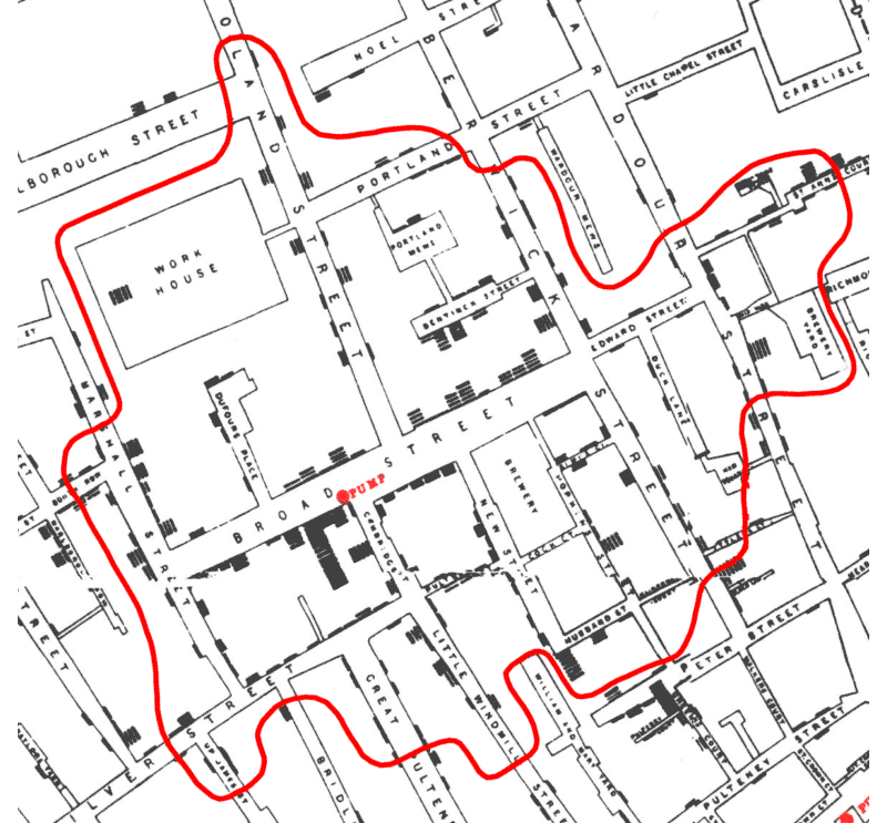 Snow produced a detailed map of London in which he marked cholera deaths using lines and the water pumps using black circles. The visual analysis of this representation revealed a clear concentration of deaths around a specific water source, while peripheral areas showed almost no cases.