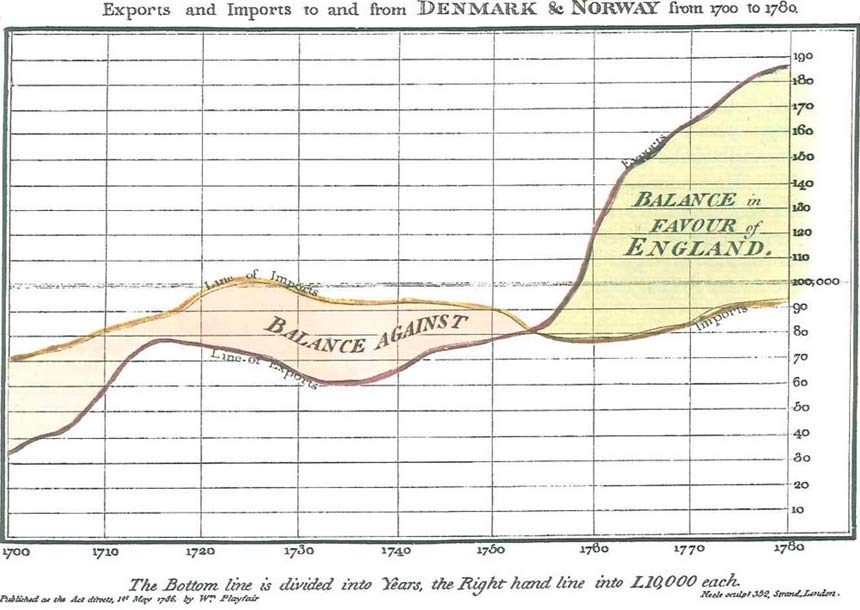 Time-series chart of the trade balance of Denmark and Norway, published in Playfair’s Commercial and Political Atlas. Source: INE.