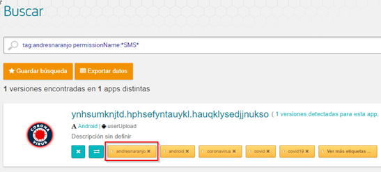 For any research, we can load the apps in batches into Tacyt and then search for them using a custom label and locating, for example, as we said, suspicious permissions: