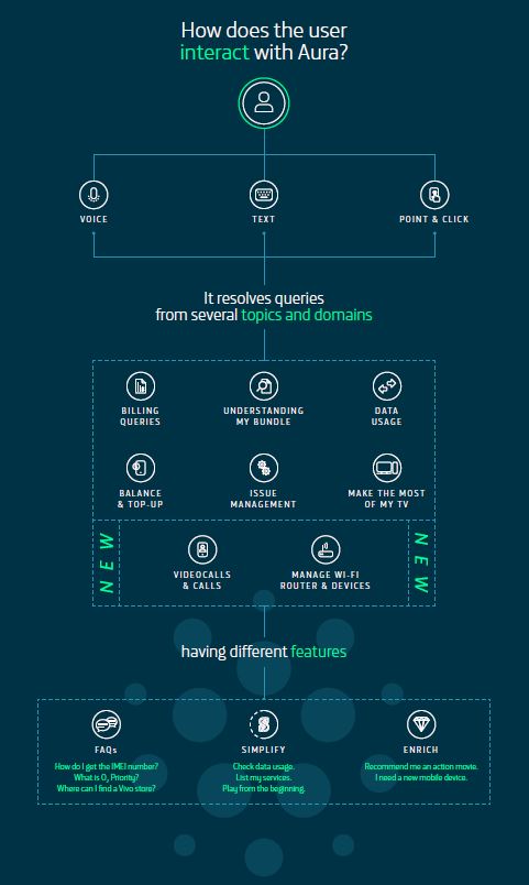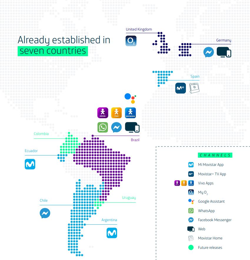 Aura is present in seven countries - Brazil, Spain, United Kingdom, Germany, Argentina, Chile and Ecuador - and will soon be available in Colombia and Uruguay, opening up a strong presence in Latin America. In addition, about two million people use this service each month with more than six million conversations and about 30 million interactions during its first year in existence. Moreover, it has more than 1,000 use cases (between personalised cases and knowledge bases)and is integrated in multiple channels, both our own channels and mobile apps (Mi Movistar; Movistar +, My O2, Meu Vivo Móvel), commercial websites and the new Movistar Home device; as well as in social channels, such as Facebook Messenger, Google Assistant and WhatsApp.