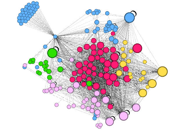 Figure 5: We used Gephi to detect 5 communities of highly connected postcodes.