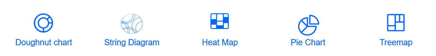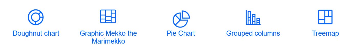 This section discusses those visualization methods that allow to show parts of a total of one or more variables. Generally, the ring or donut graph, Mekko graph, pie graph, clustered column graph and treemap would give a correct result.