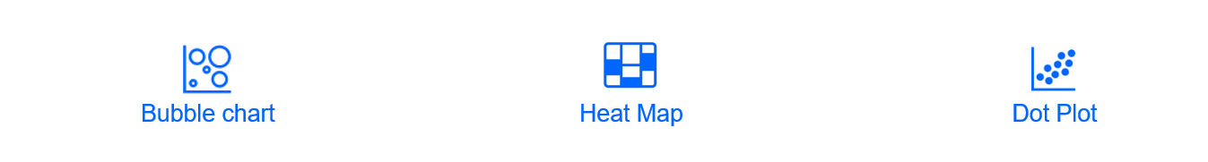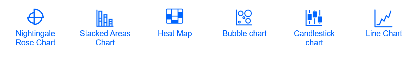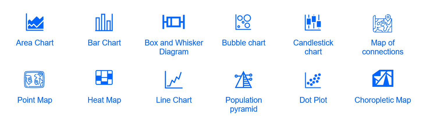 In this case, the most commonly used graphs are the area graph, bar graph, boxplot, bubble graph, candlestick graph, connection map, dot plot, heat map, line graph, population pyramid, dot plot, choropleth map, among others.