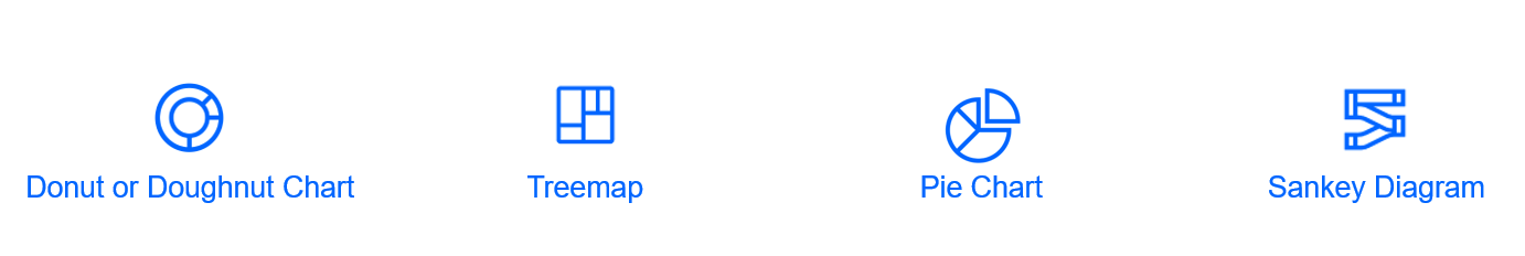 In case of looking for proportional links that form part of a total, the graphs to implement would be the donut or ring graph, treemap, pie graph, and Sankey diagram.