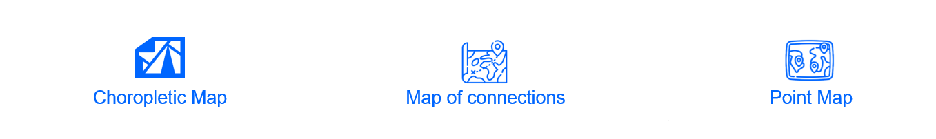 The following are suitable methods for representing geographical regions: choropletic map, connection map, and point map.