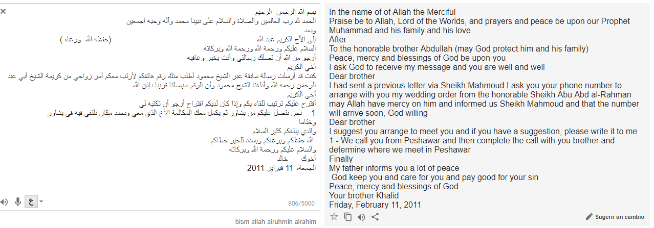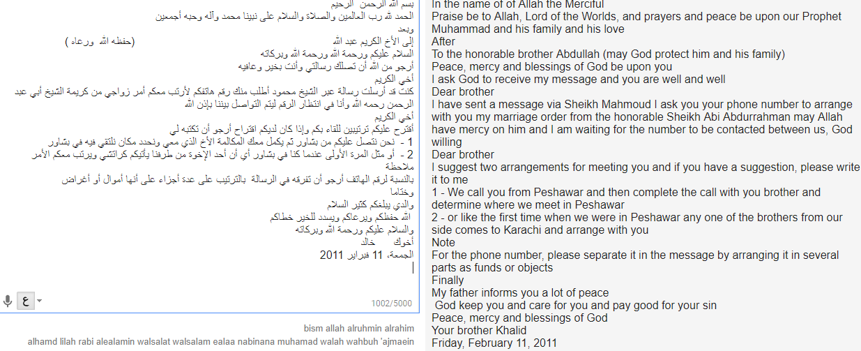 "I had sent a previous letter via Sheikh Mahmoud I ask you your phone number to arrange with you my wedding order from the honorable Sheikh Abu abd al.Rahman…" Then, a few days later, this paragraph is added "