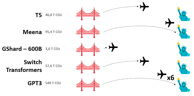 Google Flights estimates emissions from a round trip flight between San Francisco and New York are 180 tons of CO2. When compared to the emissions from training certain LLMs systems (Large Language Models), the results are as follows: