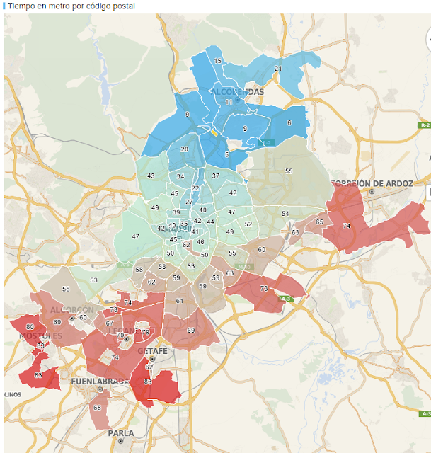 If we compare this map with the one obtained from Google's estimations of travel by car, we obtain a new map in which we can identify the difference in travel time between private car and public transport in each zone.