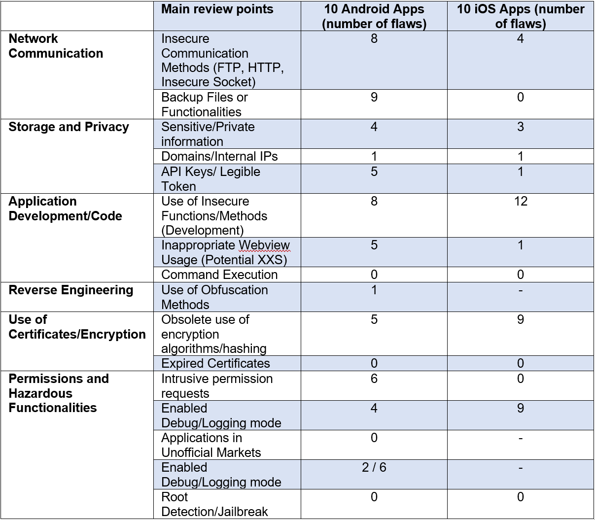 The main security controls of the OWASP Mobile Top 10 were considered for this review. They represent only an overview of a number of tests that could be performed in detail and exhaustively. The results showed that, although security controls have been implemented for the development of such applications, several weaknesses were found that should be corrected and above all continuous improvement in the development process.