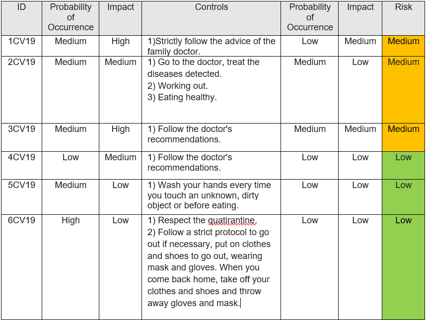 Among those issues, and discussing with colleagues and non-colleagues, I realized that most of them found it difficult to understand how to protect themselves in an adequate way to face this new COVID-19 pandemic. Also, I realized in the weekly call with my CSA colleagues about the many analogies present in the risk analysis process that we regularly perform (I hope) to analyze the risks present within our organization.
