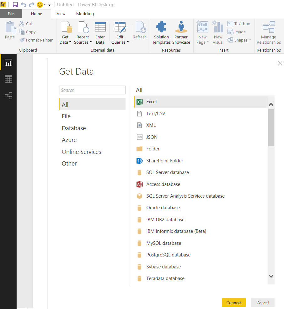 We created a new report and chose the first available data source: Excel. Get Data>Files>Local File, to find and select the Excel file you want.