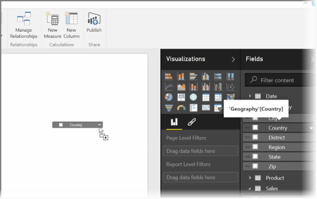The Field panel, filters can be pasted to the report as well as the Visualization panel. Through loading the data, we can see the distinct fields in which the reports can be developed.