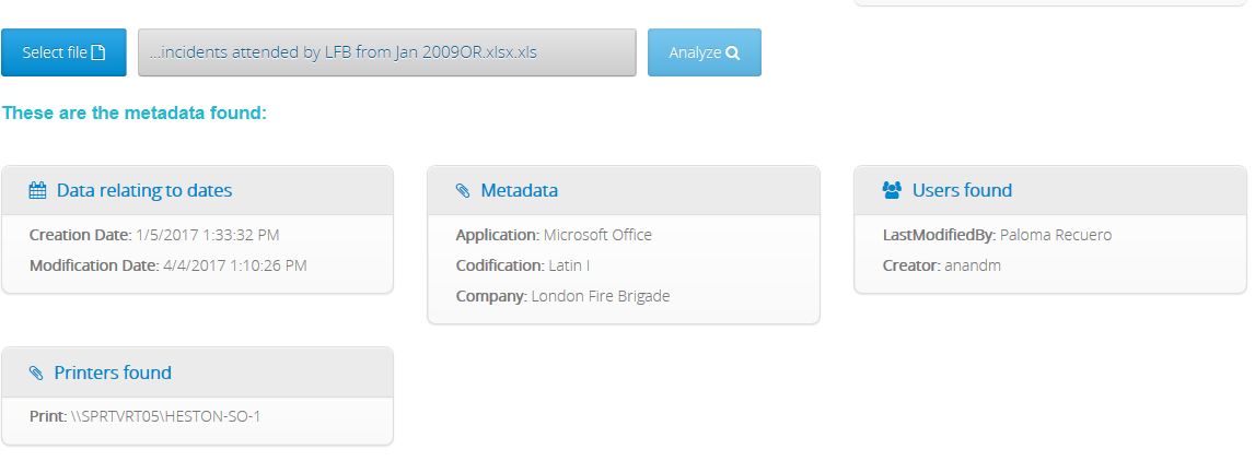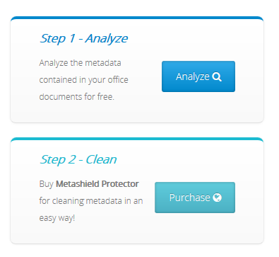 Metashield Analyzer tool to ensure security. In this case, we will simply analyze the file (Step 1). When we ourselves are the ones publishing information in a datastore we will make sure that we do not post information that could cause us to be hidden in the metadata using Metashield Protector (Step 2).