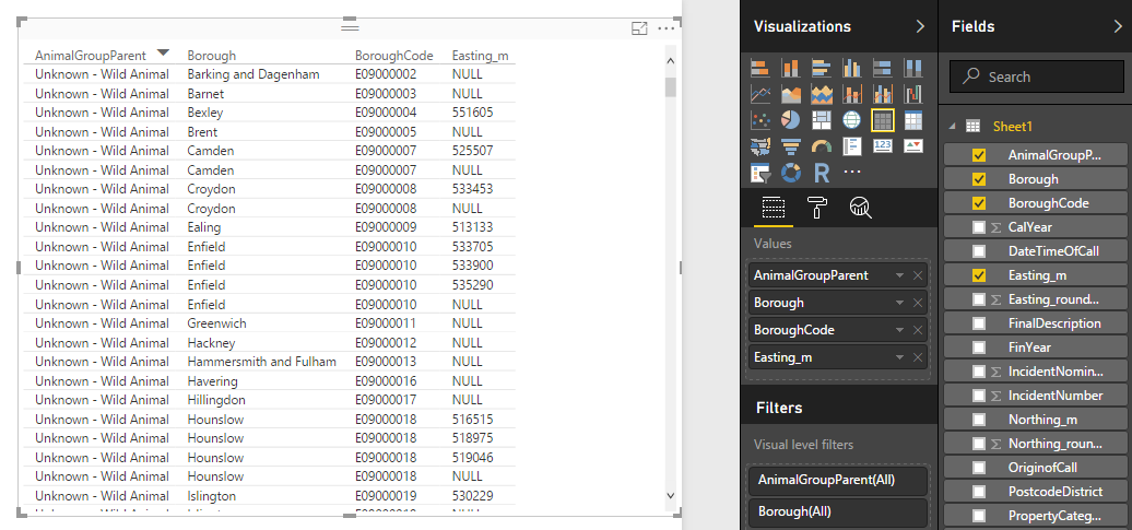Returning to our first example, we dediced to create a table visualization of the data. The bookmark is created and from this point we select the fields of data that we are interested in (highlighted in yellow), these are then added to the table.
