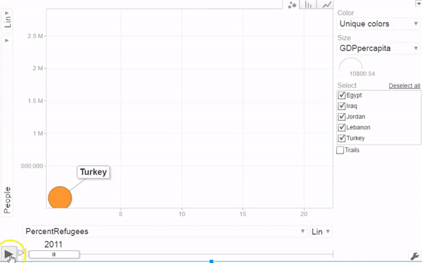 We thought it would be interesting to reorder the countries with relevance relating to the size of their population and their per capita income, both allowing us to determine their global presence. The World Bank is the source for historic data like this, giving us access to this analysis. Figure 3 was created by using this information to create the time evolution giving us a new variable: the percentage of refugees directly correlated with the total population of the country. We can note that with relation to their size Lebanon and Jordan both made more significant efforts than Turkey. In 2014, Lebanon received 21% of refugees in relation to its population.