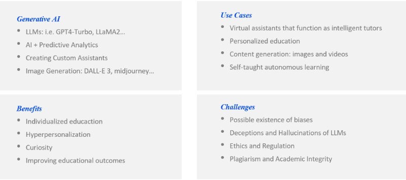 The emergence of generative Artificial Intelligence (GAI) has come to play a significant role in revolutionizing education today. Models such as LLaMA2, GPT4-Turbo and Dall-E 3 are redefining the possibilities of teaching and learning, taking educational potential to new levels and introducing into our vocabulary a new concept that we are sure to talk about a lot, EdTech.