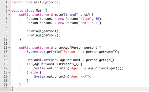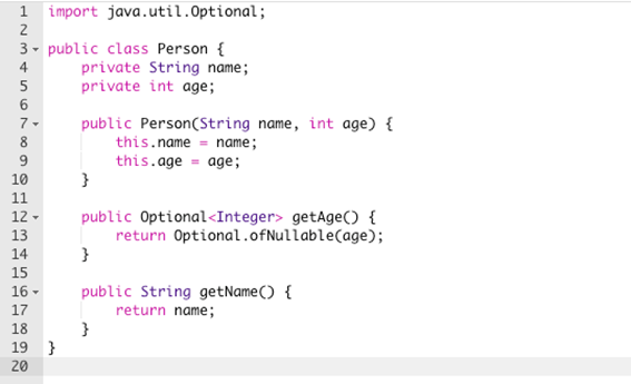 In this case we have a Person class, if we want to get the age, we have a getter method for it. So far so normal, but the funny thing is that as we don't know if that class will have the field 'age' with a value or not or if it is null, what it returns is not an integer but an object of the Optional class.