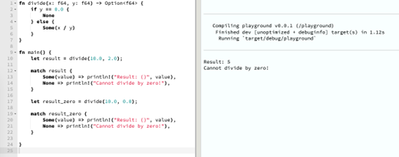 The function does not return the result of the division but an Option on which we must do a pattern capture (lines 12 to 15, for example) to determine if the operation has been correct or not.