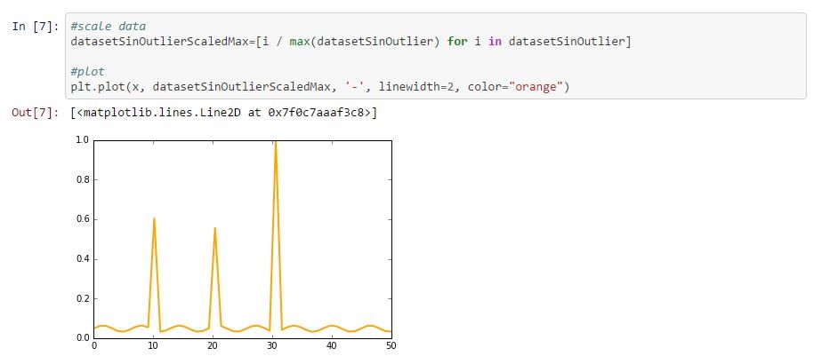 Figure 10, the data was then normalized At this point in the post, you know the story, but this case is worse than the previous one. In this case we don’t even get the highest outlier as 1, it is scaled to 0.74, which flattens the rest of the data even more.