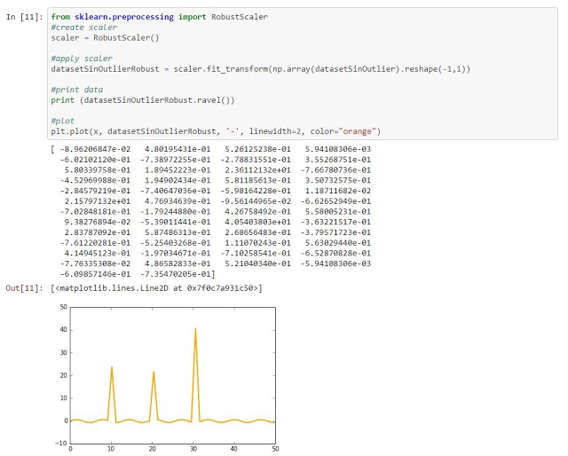 removes the median and scales the data according to the Interquartile Range (IQR). It is supposed to be robust to outliers.